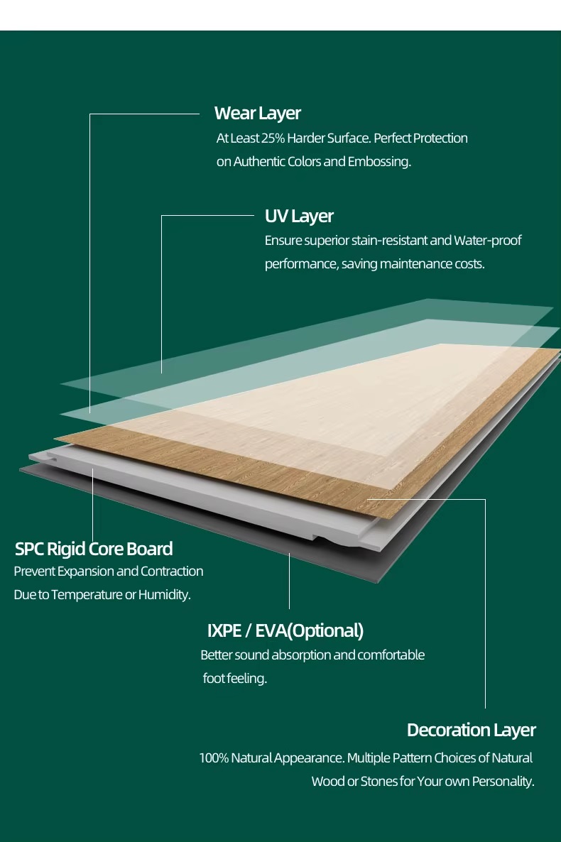 La couche résistante à l'usure de la surface du sol SPC est une couche résistante à l'usure transparente de traitement de haute technologie, sa rotation résistante à l'usure peut atteindre environ 10 000 tr/min.
